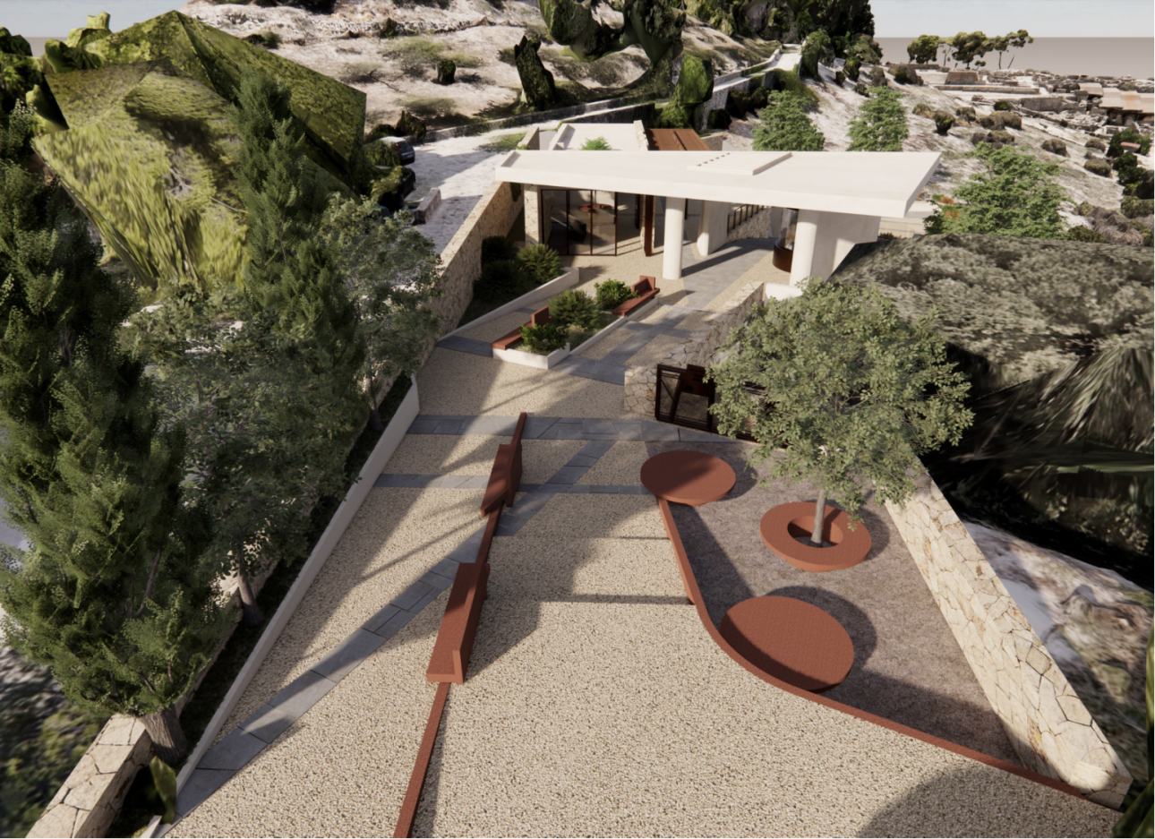- Δημιουργία πλησίον της εισόδου, νέου υπαίθριου χώρου συγκέντρωσης, με βαθμίδες και θέαση στο ανάκτορο.