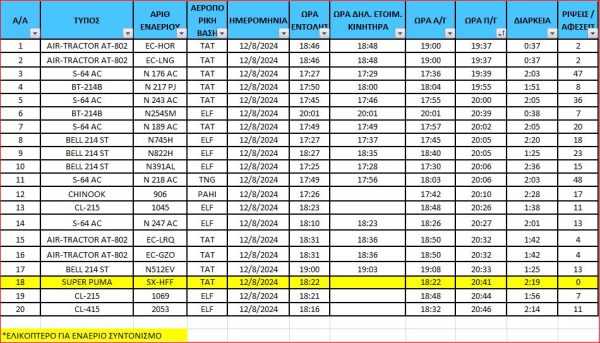 Την ανακοίνωση της Πυροσβεστικής συνοδεύει ο ακόλουθος πίνακας με την επιχειρησιακή δραστηριότητα των εναερίων μέσων τις ημέρες της πυρκαγιάς: