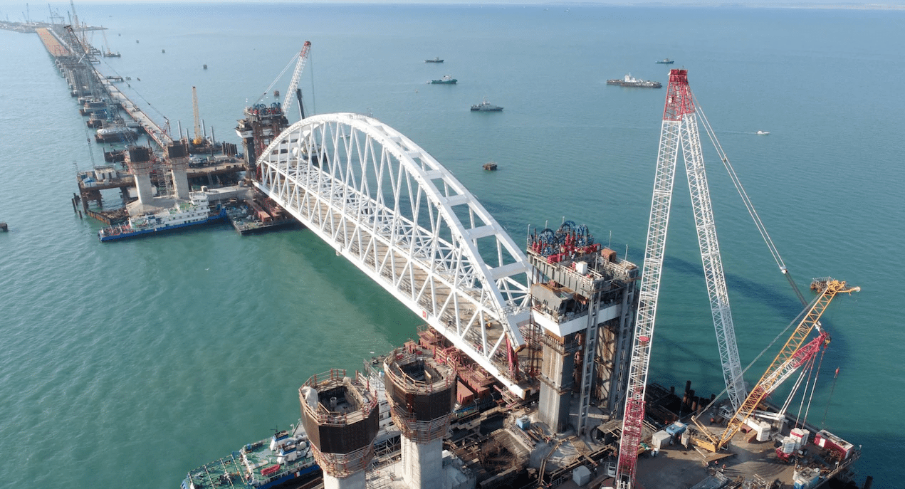Η πρώτη από τις δύο τοξοειδείς καμάρες της γέφυρας που θα ενώσει την Κριμαία με τη Ρωσία, ώστε να λάβει και φυσική υπόσταση η προσάρτηση της χερσονήσου από τη Μόσχα τον Μάρτιο του 2014, ολοκληρώθηκε πριν από μερικές ημέρες.