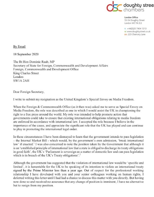 «Είμαι απογοητευμένη επειδή η κυβέρνηση σκοπεύει να εγκρίνει μια νομοθεσία – το γνωστό νομοσχέδιο για την εσωτερική αγορά – το οποίο, εάν τελικά θεσπιστεί, θα είναι, όπως το παραδέχτηκε η ίδια μας η κυβέρνηση, “μια παραβίαση του διεθνούς δικαίου”», αναφέρει στην σχετική επιστολή η 42χρονη νομικός.
