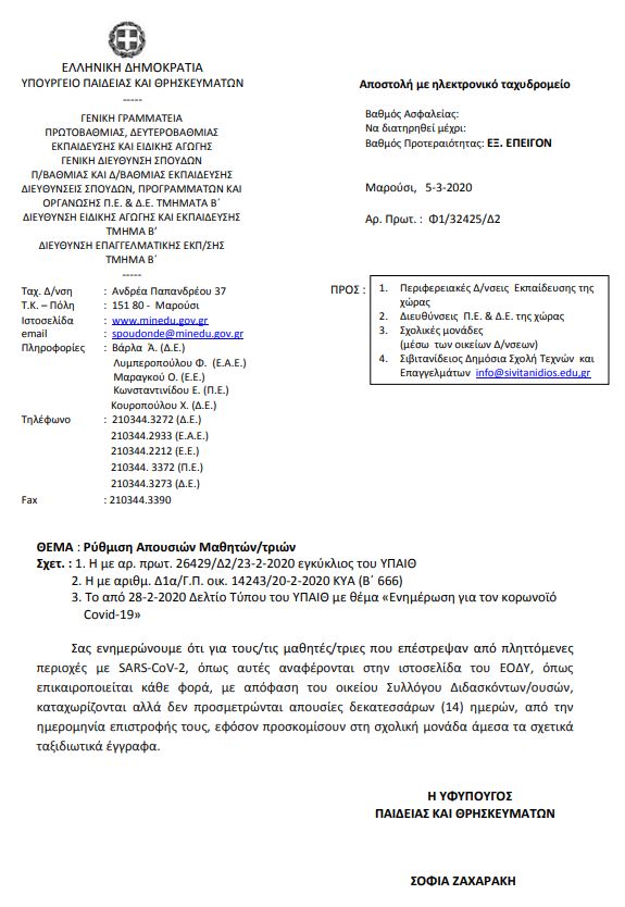 Την πρόβλεψη απουσιών 14 ημερών για τα παιδιά που επιστρέφουν από πληττόμενες από τον κορονοϊό περιοχές –π.χ. Ιταλία– εμπεριέχει η υπουργική απόφαση που υπογράφηκε την Πέμπτη από την υφυπουργό Παιδείας, Σοφία Ζαχαράκη.