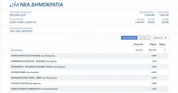 Στο 1,55% της ενσωμάτωσης ακολουθούσαν οι νυν ευρωβουλευτές Λίζα Βόζεμπεργκ, Μαρία Σπυράκη, Γιώργος Κύρτσος και Μανώλης Κεφαλογιάννης με «σφήνα» την πρώην πλέον βουλευτή της Β’ Αθηνών Αννα-Μισέλ Ασημακοπούλου.