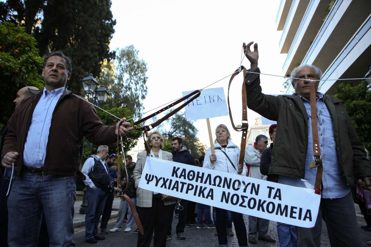 Οι διαδηλωτές κρατούσαν πανό με συνθήματα τα οποία έχουν κρεμάσει σε ιμάντες με τους οποίους δένουν τους ψυχικά πάσχοντες. «Έχουμε να κάνουμε με μια κυβέρνηση που είναι κλούβια στην ιδεολογία», ανέφερε ο πρόεδρος της ΠΟΕΔΗΝ.