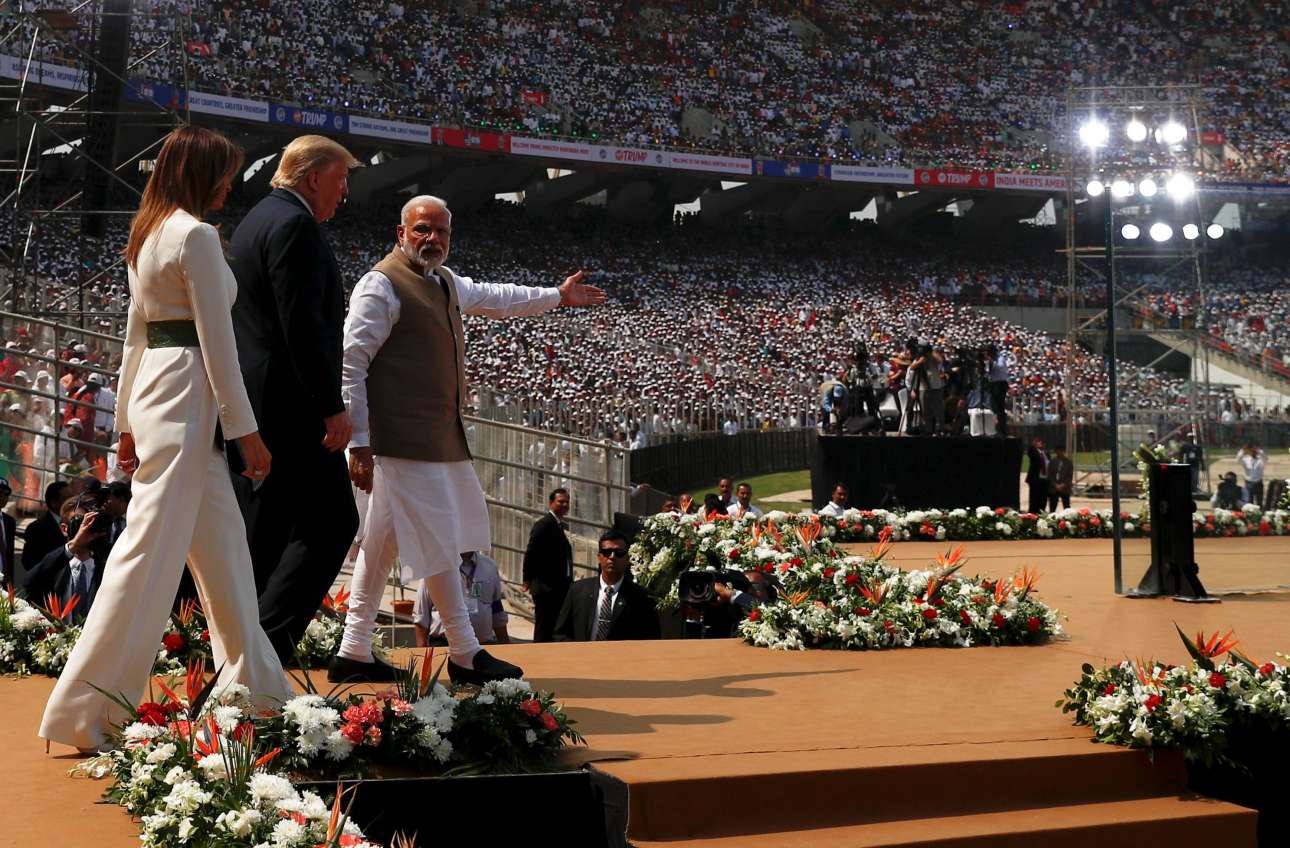 Ο Μόντι, ινδουιστής εθνικιστής πολιτικός που έχει αποπειραθεί να οικοδομήσει στενή προσωπική σχέση με τον Τραμπ, προετοίμαζε καιρό αυτήν τη φαντασμαγορική υποδοχή.