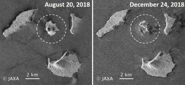 Δορυφορικές φωτογραφίες, που τραβήχτηκαν πριν και μετά την έκρηξη από την ιαπωνική Διαστημική Υπηρεσία, έδειξαν ότι δύο τετραγωνικά χιλιόμετρα του ηφαιστειογενούς νησιού, στο οποίο βρίσκεται το Ανάκ Κρακατόα, χάθηκαν κάτω από τα κύματα.