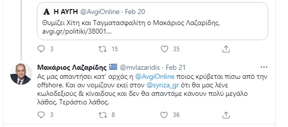 Και έπειτα, όταν η «Αυγή» είπε ότι με κάτι τέτοια ο κ. Λαζαρίδης «θυμίζει Χίτη και Ταγματασφαλίτη», ο βουλευτής της ΝΔ απάντησε ως εξής: