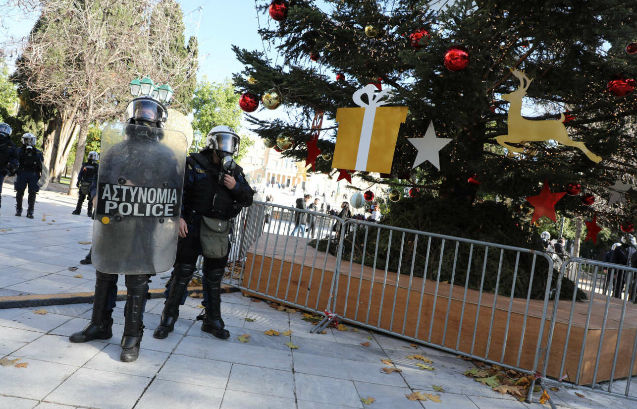 Σουρεάλ γιορτινή Αθήνα: Ανδρες των ΜΑΤ έχουν περικυκλώσει το έλατο στο Σύνταγμα για να μην καεί