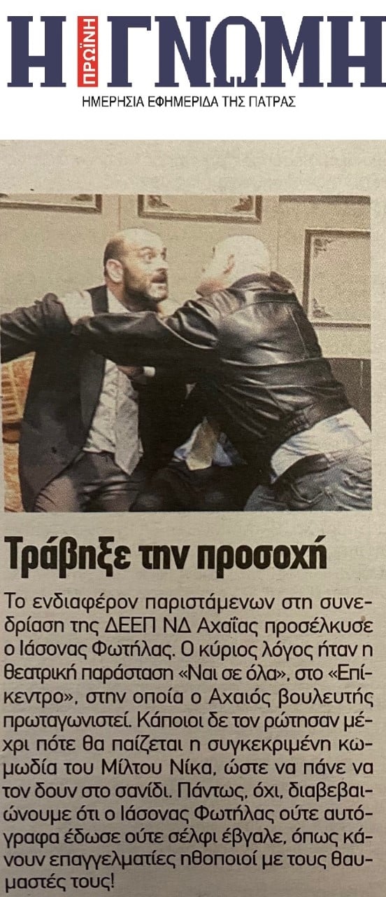 Ο κ. Φωτήλας, ο οποίος εκτός από φέρελπις ηθοποιός είναι και δικηγόρος και φυσικά κυβερνητικός βουλευτής, ανήρτησε υπερήφανος και τα σχετικά αποκόμματα από τον τοπικό Τύπο.