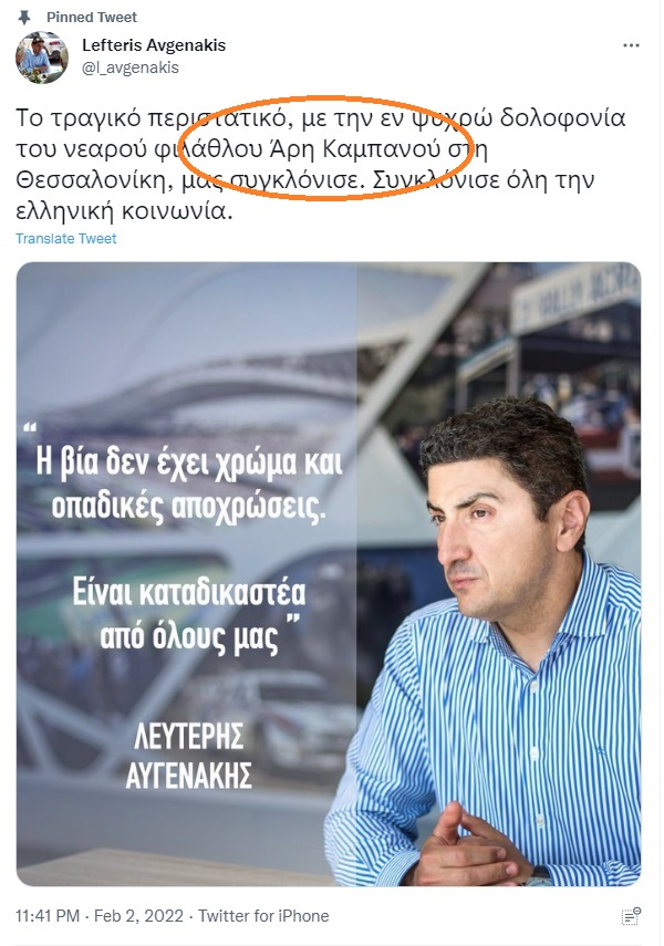 Η ελληνική κοινωνία είναι συγκλονισμένη με τη δολοφονία του Αλκιβιάδη (Αλκη) Καμπανού και η κυβέρνηση δηλώνει ορθώς ότι αποτελεί προτεραιότητά της η καταπολέμηση της οπαδικής βίας –θύμα της οποίας υπήρξε ο άτυχος 19χρονος που έχασε τη ζωή του στη Θεσσαλονίκη από το χέρι ενός σεσημασμένου χούλιγκαν του ΠΑΟΚ, επειδή στην ερώτηση «τι ομάδα είσαι;» απάντησε «Αρης».