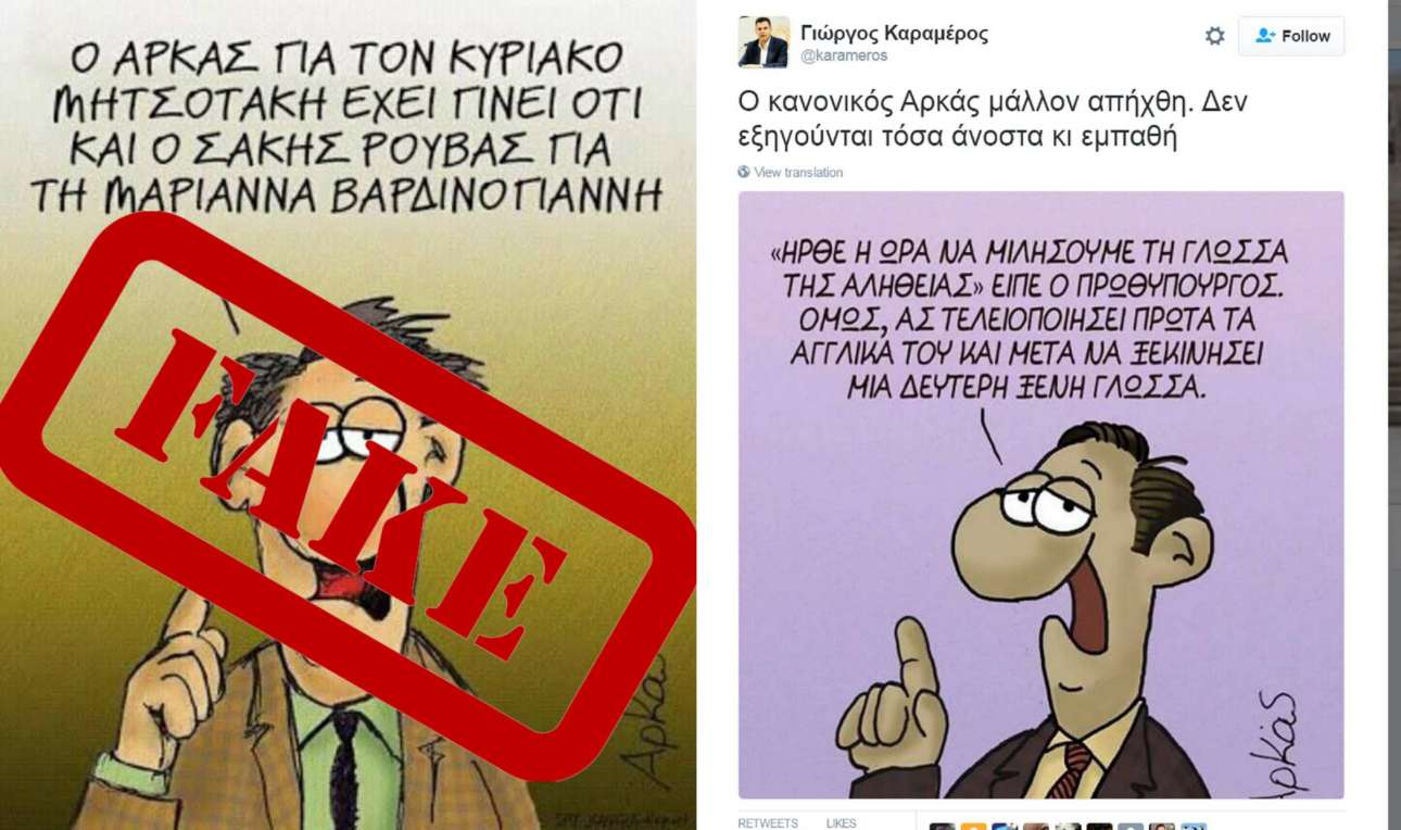 Ηταν ζήτημα χρόνου. Με τη δεύτερη φορά που ο Κυριάκος Μητσοτάκης (σ.σ.: ελλείψει δικής του original ανάλυσης) χρησιμοποίησε σκίτσα του Αρκά για να επιτεθεί στον Αλέξη Τσίπρα, άρχισε και η αντεπίθεση. Το σύνθημα δόθηκε πρώτα με tweet του Περιφερειάρχη Βορείου Αττικής Γιώργου Καραμέρου ο οποίος έγραψε πως «ο κανονικός Αρκάς μάλλον απήχθη. Δεν εξηγούνται τόσα άνοστα και εμπαθή» (σ.σ.: Σχόλια; Σκίτσα; Δεν συνεχίζει το κείμενο). Και από κάτω ένα μάλλον παραλλαγμένο σκίτσο που καυτηριάζει το περίφημο tweet του Αλέξη Τσίπρα για τους πολιτικούς που πρέπει να μιλάνε τη γλώσσα της αλήθειας.