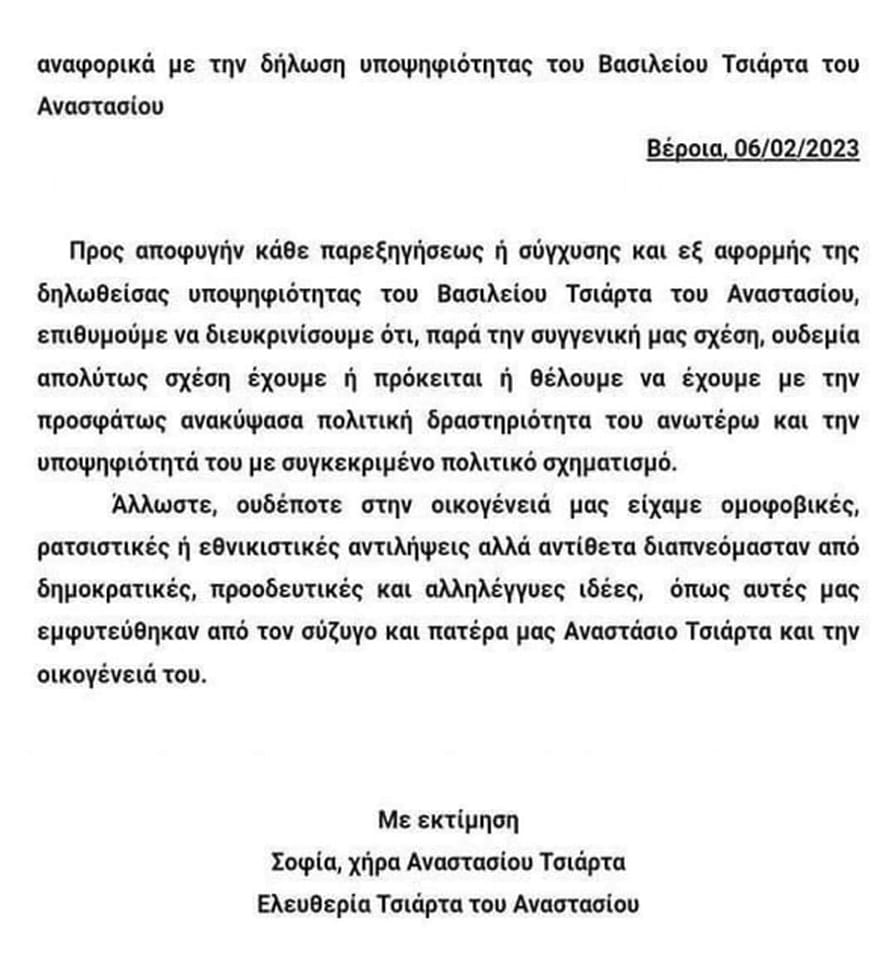 Σε δήλωσή τους η μητέρα του κ. Τσιάρτα, Σοφία, και η αδελφή του, Ελευθερία, ανέφεραν: «Ουδεμία απολύτως σχέση έχουμε ή πρόκειται ή θέλουμε να έχουμε με την προσφάτως ανακύψασα πολιτική δραστηριότητα του ανωτέρω (του κ. Τσιάρτα) και την υποψηφιότητά του με συγκεκριμένο πολιτικό σχηματισμό».