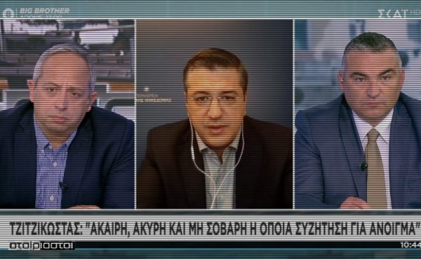 O Απόστολος Τζιτζικώστας πήρε τη θέση του ανάμεσα στους Χρήστο Κούτρα και Γιάννη Ντσούνο (τους «Αταίριαστους» του ΣΚΑΪ) και άρχισε να περιγράφει τι γίνεται και τι πρέπει να γίνει στη Θεσσαλονίκη με την επιδημία του κορονοϊού.