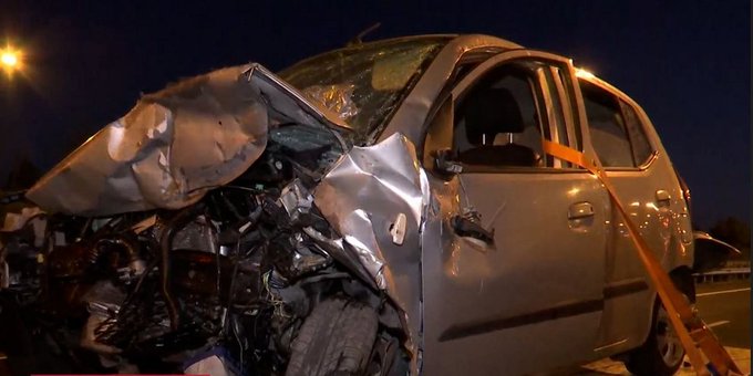 Η σύγκρουση των δύο οχημάτων ήταν σφοδρή (στη φωτογραφία, το αυτοκίνητο που μπήκε ανάποδα στον αυτοκινητόδρομο, διαλυμένο).