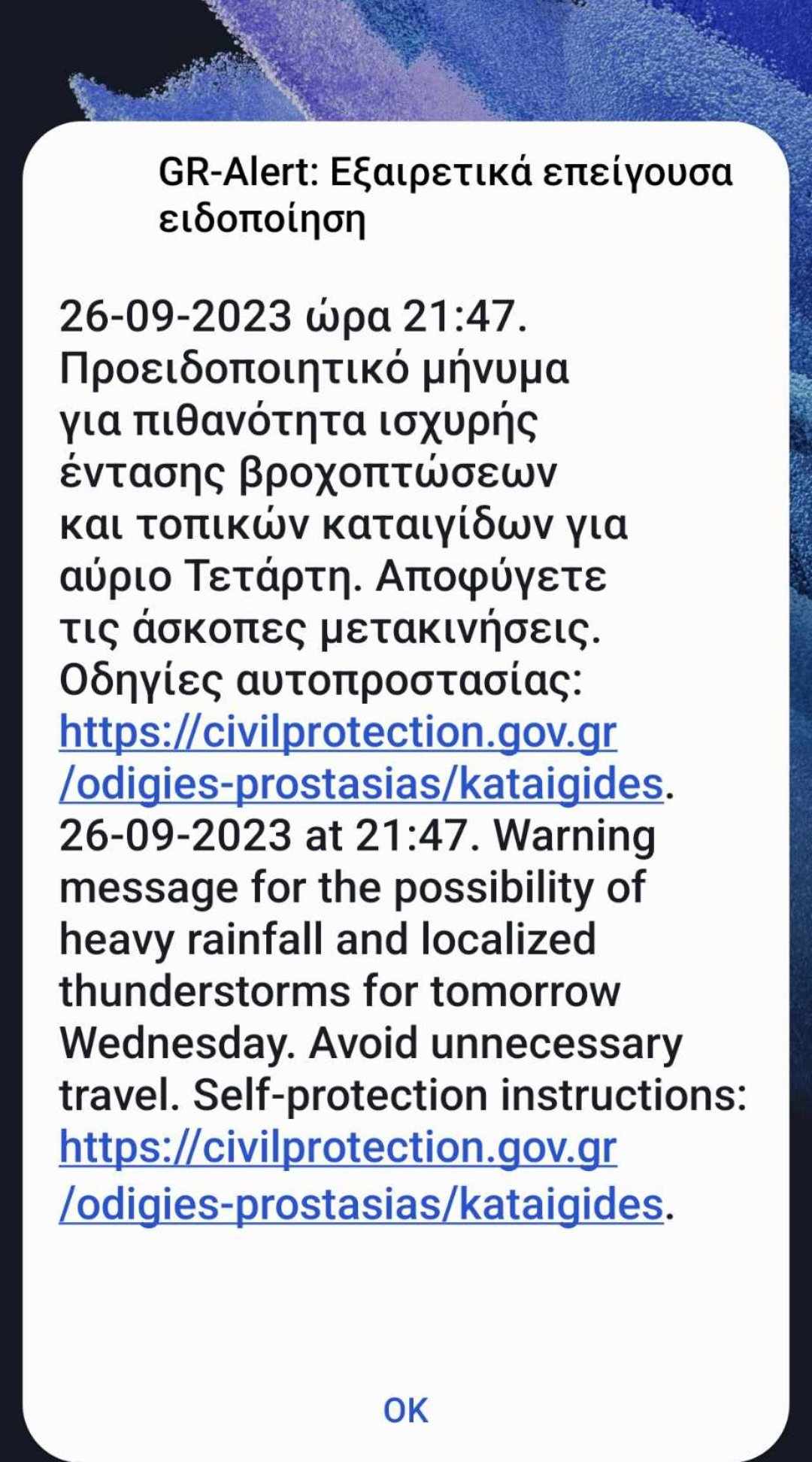Ειδικότερα το μήνυμα ανέφερε: «Προειδοποιητικό μήνυμα για πιθανότητα ισχυρής έντασης βροχοπτώσεων και τοπικών καταιγίδων για αύριο Τετάρτη. Αποφύγετε τις άσκοπες μετακινήσεις. Οδηγίες αυτοπροστασίας: https://civilprotection.gov.gr/odigies-prostasias/kataigides».