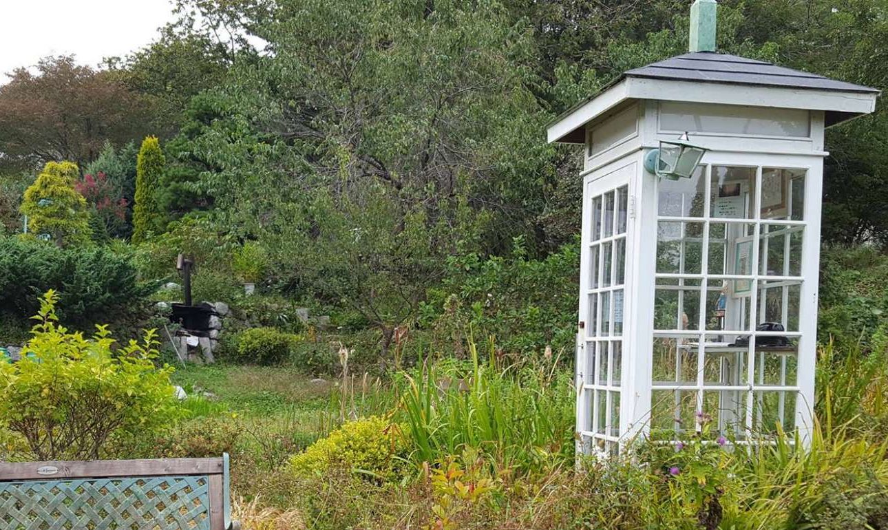 Το τηλέφωνο και ο λευκός θάλαμος στήθηκαν από τον 74χρονο σχεδιαστή κήπων Ιτάρου Σασάκι μέσα στον κήπο του, σε ένα μικρό λόφο με καταπληκτική θέα στη θάλασσα.