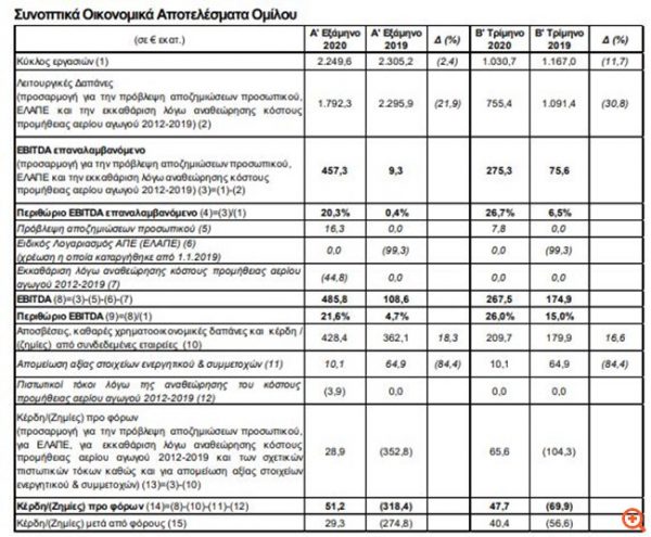Σε επίπεδο εξαμήνου, το επαναλαμβανόμενο EBITDA ανήλθε σε 457,3 εκατ. ευρώ αυξημένο κατά 448 εκατ. ευρώ από τα 9,3 εκατ. στο πρώτο εξάμηνο του 2019. Σημειώνεται ότι η βελτίωση στη λειτουργική κερδοφορία επήλθε παρά τη μείωση του κύκλου εργασιών κατά 11,7% από τα 2,3052 δισ. ευρώ πέρυσι στα 2,2496 δισ. ευρώ εφέτος.