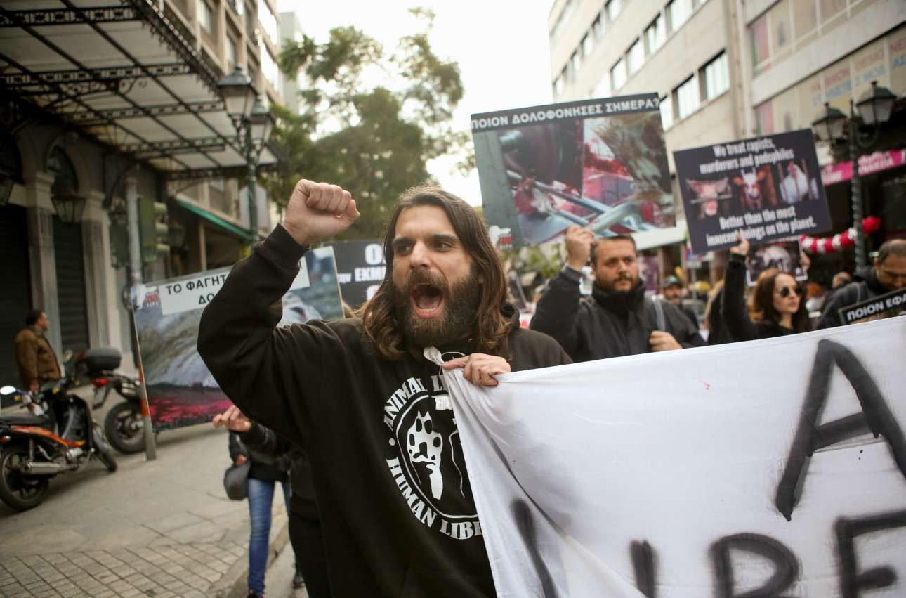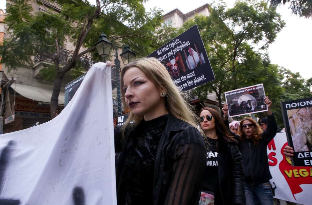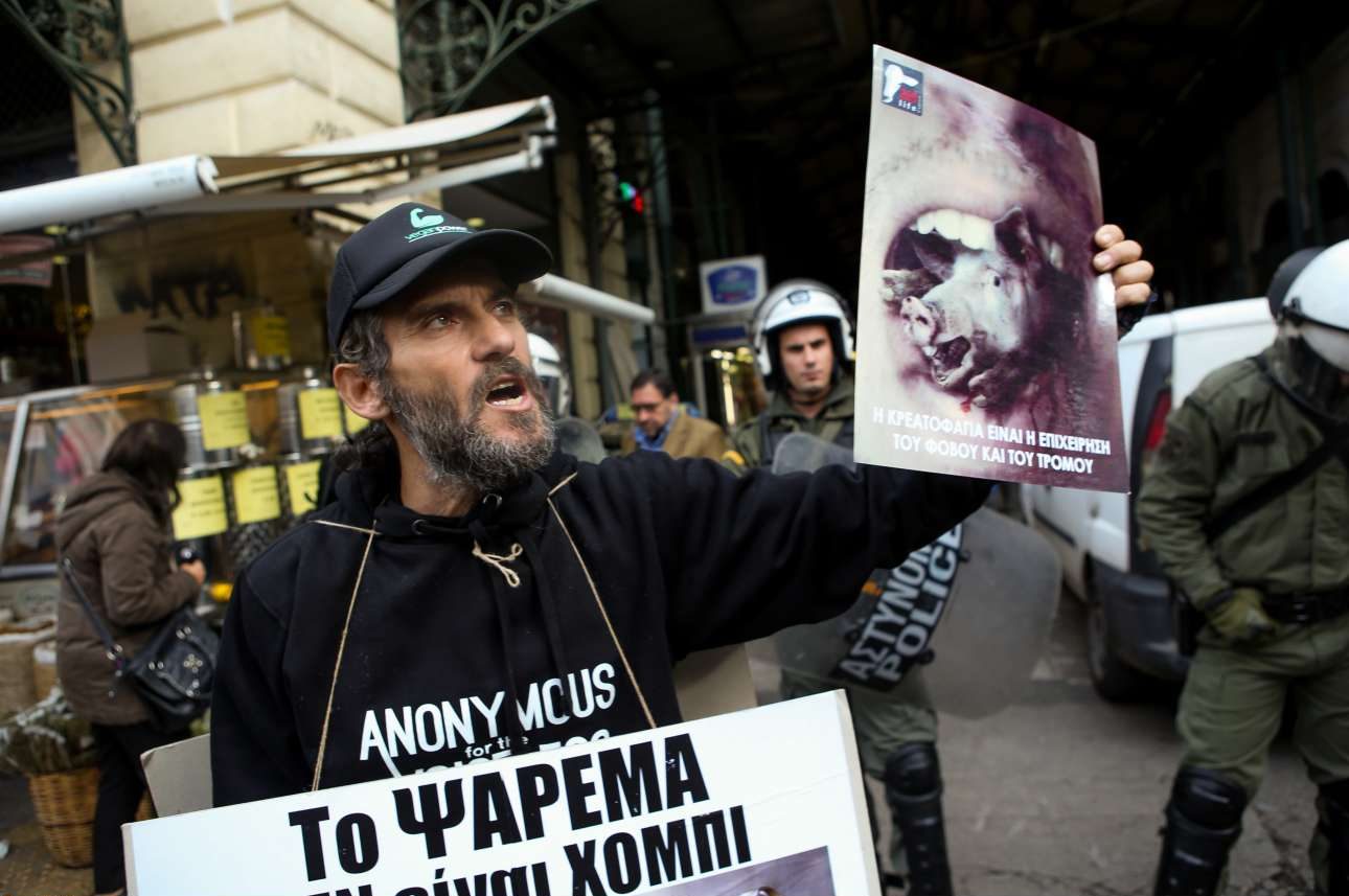 Συγκέντρωση διαμαρτυρίας στο Μοναστηράκι και έπειτα πορεία προς τη Βαρβάκειο Αγορά πραγματοποίησαν το Σάββατο μέλη vegan ακτιβιστικών ομάδων.
