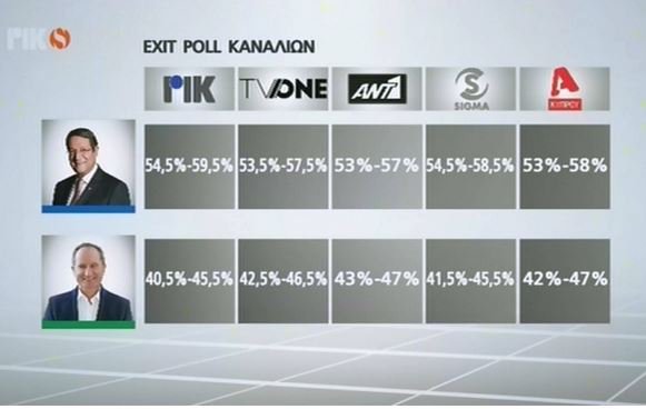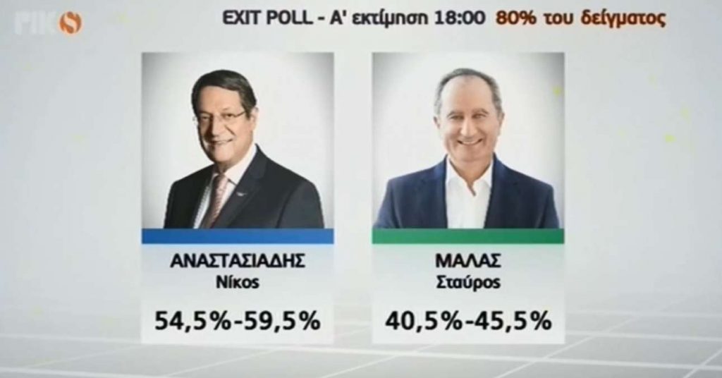 Τα εκτιμώμενα αποτελέσματα του δεύτερου γύρου των προεδρικών εκλογών στην Κύπρο ανακοινώθηκαν λίγο μετά τις 18.00 της Κυριακής και σύμφωνα με το exit poll του Ραδιοφωνικού Ιδρύματος Κύπρου, το σκηνικό διαμορφώνεται ως εξής: