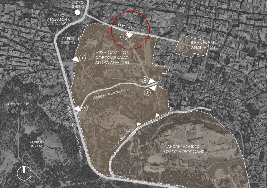Το έργο αφορά στην αναβάθμιση της εικόνας και της λειτουργικότητας των εισόδων του αρχαιολογικού χώρου με προτεραιότητα στην κύρια είσοδο επί της οδού Αδριανού για την εξυπηρέτηση των ροών εισόδου-εξόδου, καθώς και στη λειτουργική εξυπηρέτηση των αναγκών των επισκεπτών ΑμεΑ. Περιλαμβάνονται η σύνδεση των εισόδων με τα σημεία στάσης, θέασης και τα σημεία πληροφόρησης του χώρου, η αναβάθμιση των χώρων υγιεινής, συμπεριλαμβανομένων των δικτύων ύδρευσης και αποχέτευσης, που εξυπηρετούν τον αρχαιολογικό χώρο, λαμβάνοντας υπόψη την πρόσβαση και εξυπηρέτηση των επισκεπτών με αναπηρία. Επίσης, προβλέπεται η χωροθέτηση κατάλληλου αστικού εξοπλισμού στις εισόδους για τη βελτίωση της εμπειρίας του επισκέπτη στον αρχαιολογικό χώρο.