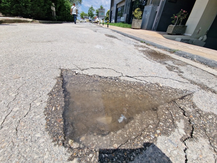 Εμφανής, η λακούβα που έμεινε στην άσφαλτο από την πτώση του βάρους 400 (!) κιλών χρηματοκιβωτίου (δείτε τη φωτογραφία κάτω).