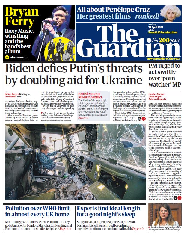 ⇒Το πρωτοσέλιδο του Guardian: Ο Μπάιντεν αψηφά τις απειλές του Πούτιν και διπλασιάζει τη βοήθεια για την Ουκρανία.