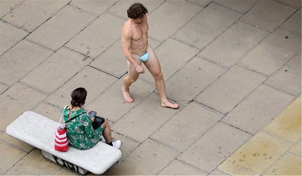 Καθώς ο άντρας περπατούσε στην Όξφορντ Στριτ, ανέμελος και ολόγυμνος εξαιρουμένης της γαλάζιας μάσκας που έκρυβε τα γεννητικά του όργανα, κάποιοι τραβούσαν φωτογραφίες με τα κινητά τηλέφωνά τους ενώ άλλοι απλώς τον κοίταζαν με περιέργεια.