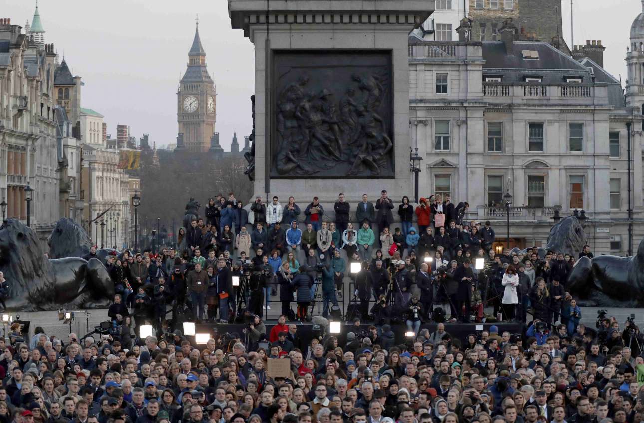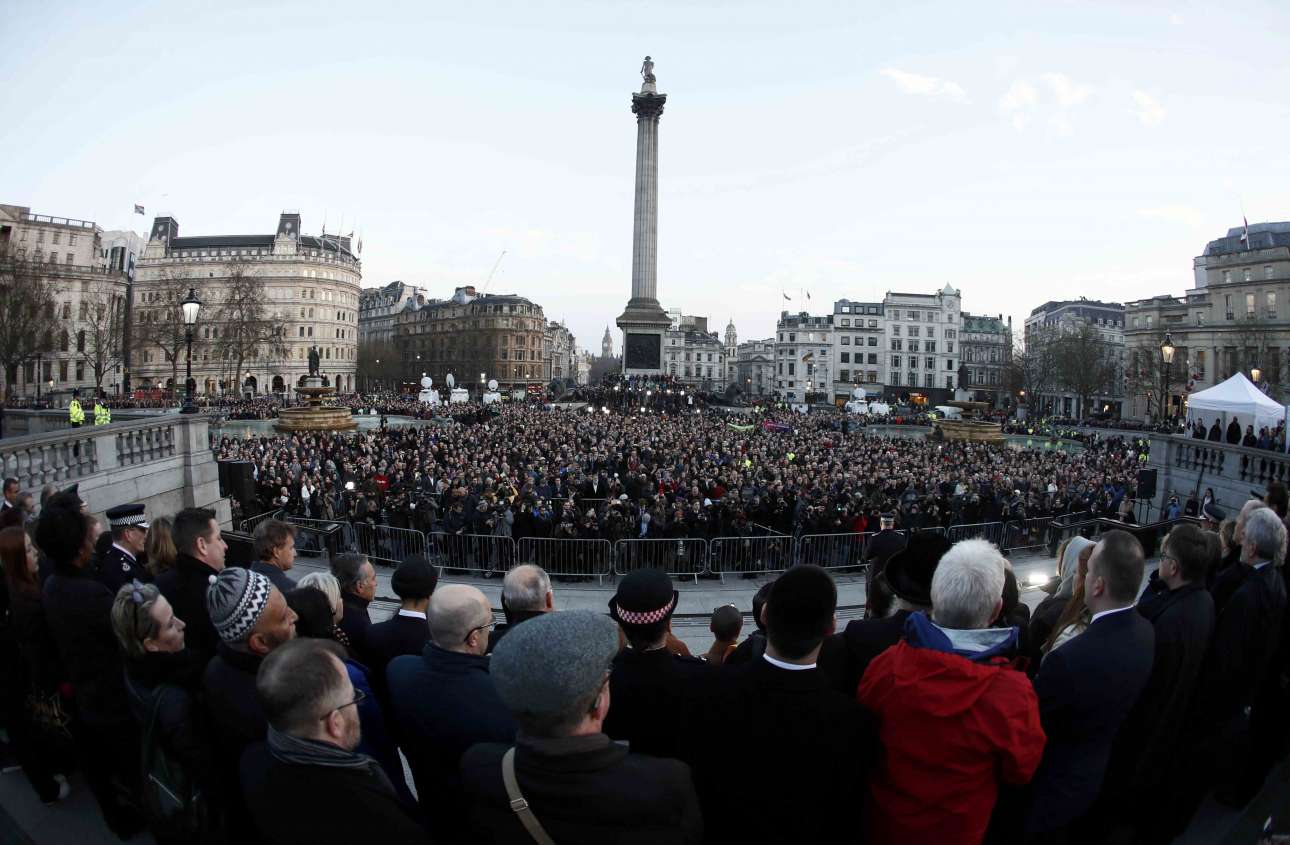 Εκατοντάδες άνθρωποι συγκεντρώθηκαν την Πέμπτη στην πλατεία Τραφάλγκαρ, στο κέντρο του Λονδίνου, για να τιμήσουν τη μνήμη των θυμάτων της επίθεσης. Μία απόκοσμη ησυχία βασίλευε στη συνήθως πολύβουη πλατεία, καθώς είχε διακοπεί η κυκλοφορία γύρω από αυτήν και οι εθελοντές μοίραζαν κεριά στο πλήθος.