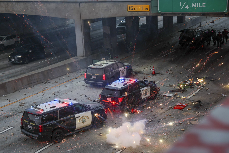 Η Εθνοφρουρά είχε αναπτυχθεί γύρω από κυβερνητικά κτίρια, την ώρα που η αστυνομία και διαδηλωτές συγκρούονταν στη περιθώριο διάφορων κινητοποιήσεων κατά των επιδρομών της ομοσπονδιακής υπηρεσίας μετανάστευσης (ICE) για τη σύλληψη παράτυπων μεταναστών στο Λος Αντζελες.
