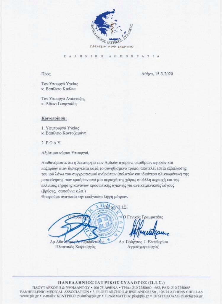 Ιδιαίτερα επικίνδυνη για τη μαζική μετάδοση του κορονοϊού σε άτομα μεγάλης ηλικίας είναι η λειτουργία των υπαίθριων λαϊκών αγορών, τονίζει σε επιστολή που απηύθυνε την Κυριακή ο Πανελλήνιος Ιατρικός Σύλλογος (ΠΙΣ) στον υπουργό Υγείας Βασίλη Κικίλια.