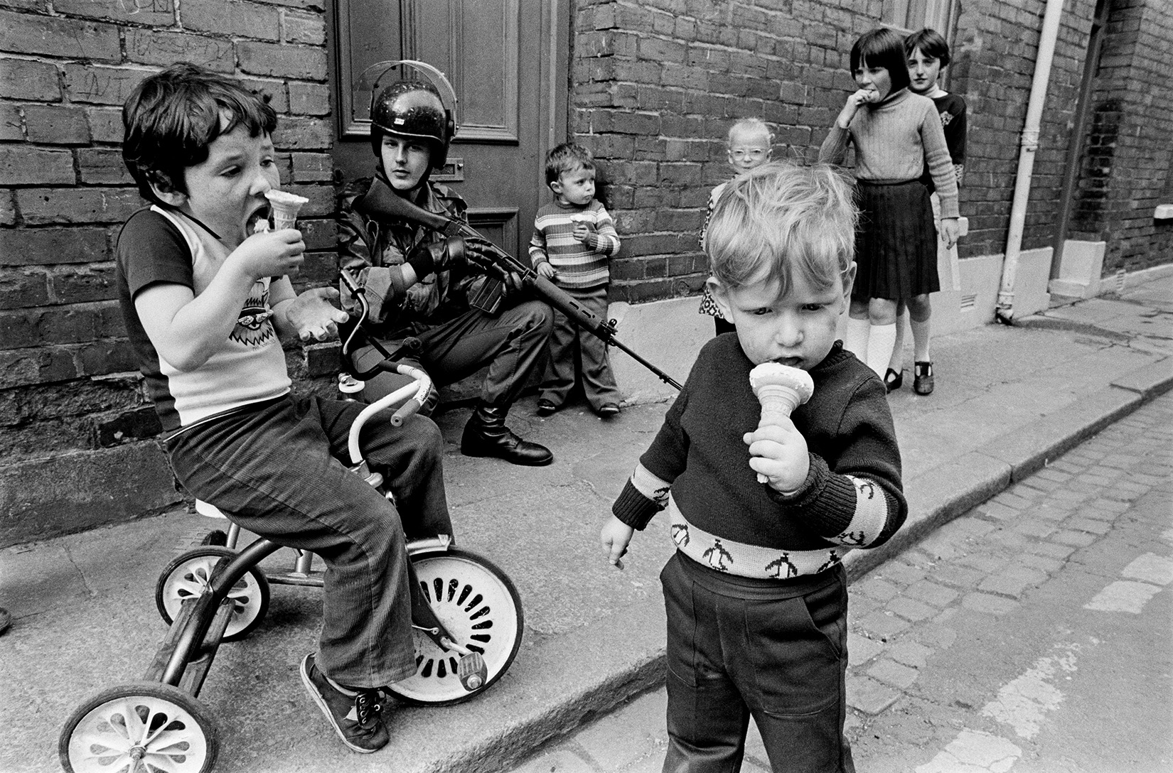 Οι φωτογραφίες περισσότερων από 70 φωτογράφων του Magnum, που διατίθενται προς πώληση, καλύπτουν έξι δεκαετίες και όλες μαζί, δημιουργούν μια συναρπαστική επισκόπηση του εμβληματικού πρακτορείου, της Ιστορίας και του φωτορεπορτάζ. Η δημοπρασία περιλαμβάνει εικόνες από σημαντικά ιστορικά γεγονότα, όπως η φωτογραφία του Στιούαρτ Φράνκλιν που απεικονίζει έναν νεαρό διαδηλωτή στην πλατεία Τιενανμέν, το 1989, ή εκείνη του Πίτερ Μάρλοου (επάνω)με τα φαινομενικά ανέμελα παιδιά που τρώνε παγωτό, ενώ περιτριγυρίζουν έναν στρατιώτη στο Londonderry/Derry το 1979.
