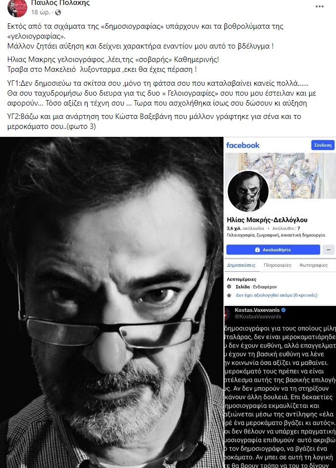 «Ακολουθώντας τη συνήθη πρακτική του, ο Βουλευτής Χανίων του ΣΥΡΙΖΑ προέβη, για μια ακόμα φορά, σε προγραφές, αυτή τη φορά σε βάρος του σκιτσογράφου Ηλία Μακρή, επειδή ενοχλήθηκε από το σκίτσο του.
