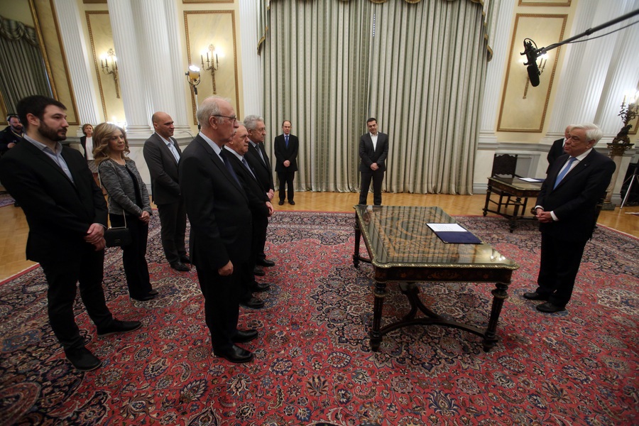 «Διαβεβαιώνω στην τιμή και υπόληψή μου ότι θα τηρώ το Σύνταγμα και τους νόμους και ότι θα υπηρετώ το γενικό συμφέρον του ελληνικού λαού», είπαν με μία φωνή οι νέοι υπουργοί και υφυπουργοί Γιάννης Δραγασάκης, Δημήτρης Βίτσας, Μερόπη Τζούφη, Κωνσταντίνος Στρατής και Νάσος Ηλιόπουλος και ο αναπληρωτής υπουργός Εθνικής Αμυνας Φώτης Κουβέλης που επέστρεψε μετά από καιρό στο Προεδρικό Μέγαρο.