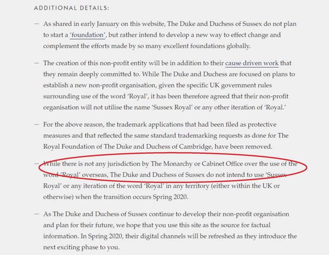 Τέλος, το ζευγάρι είναι υποχρεωμένο να αλλάξει και το όνομα του φιλανθρωπικού του ιδρύματος «Sussex Royal, The Foundation of the Duke and Duchess of Sussex».