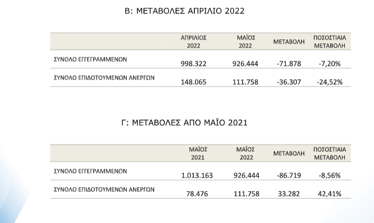 Ειδικότερα, όπως ανακοινώθηκε, το σύνολο των εγγεγραμμένων ανέργων, με κριτήριο την αναζήτηση εργασίας (αναζητούντων εργασία), τον Μάιο του 2022, ανήλθε σε 919.236 άτομα. Από αυτά, 532.600 (ποσοστό 57,94%) είναι εγγεγραμμένα στο μητρώο της ΔΥΠΑ για χρονικό διάστημα ίσο ή και περισσότερο των 12 μηνών και 386.636 (ποσοστό 42,06%) είναι εγγεγραμμένα στο μητρώο της ΔΥΠΑ για χρονικό διάστημα μικρότερο των 12 μηνών. Οι άνδρες ανήλθαν σε 318.977 (ποσοστό 34,70%) και οι γυναίκες ανήλθαν σε 600.259 (ποσοστό 65,30%).