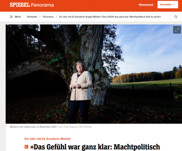 Ο δημοσιογράφος, συγγραφέας και επίσης Ανατολικογερμανός Αλεξάντερ Όσαγκ, τη συνάντησε στο νέο πολιτικό της γραφείο έναν χρόνο μετά την επίσημη αποχώρησή της από την καγκελαρία και εκείνη την συμβολική εκδήλωση με στρατιωτικές τιμές προς τιμή της πρώτης γυναίκας καγκελαρίου που παρέμεινε στο αξίωμα αυτό για 16 χρόνια.