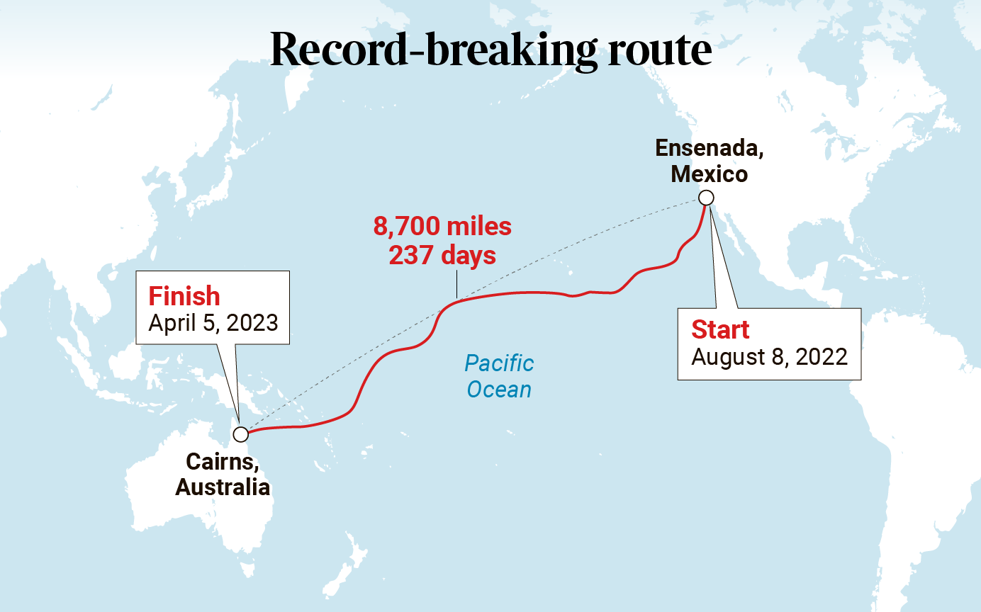 Η Λι, χρειάστηκε 237 ημέρες για να διανύσει 14.000 χλμ από την Ενσενάδα του Μεξικού μέχρι την Κέιρνς της Αυστραλίας με το οκτάμετρο σκάφος της, κατασκευασμένο από ίνες άνθρακα. Το ταξίδι της ξεκίνησε στις 8 Αυγούστου του 2022 και ολοκληρώθηκε, επτά μήνες αργότερα, στις 5 Απριλίου, νωρίτερα μάλιστα από ό,τι υπολόγιζε.