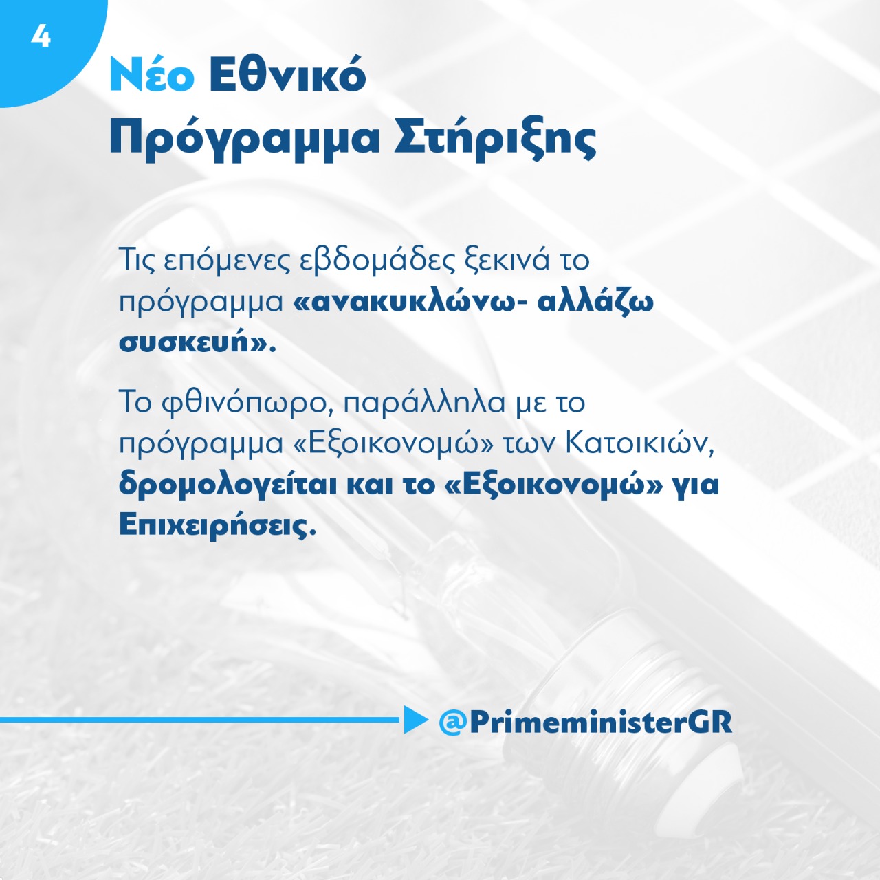 Τέλος, μετατρέπουμε την εξοικονόμηση ενέργειας σε «ασπίδα» κάθε πολίτη και κάθε επιχείρησης απέναντι στους εκβιασμούς όσων ποντάρουν στην άσκοπη σπατάλη της.