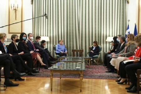 Αμεσώς μετά τη συνάντησή της με την Πρόεδρο της Δημοκρατίας (εδώ) στο Προεδρικό Μέγαρο, η Ανγκελα Μέρκελ, κατευθύνθηκε στο Μέγαρο Μαξίμου, όπου την υποδέχθηκε ο Πρωθυπουρός με χαμόγελα και τον χαιρετισμό της γροθιάς στην εποχή του κορονοϊού.