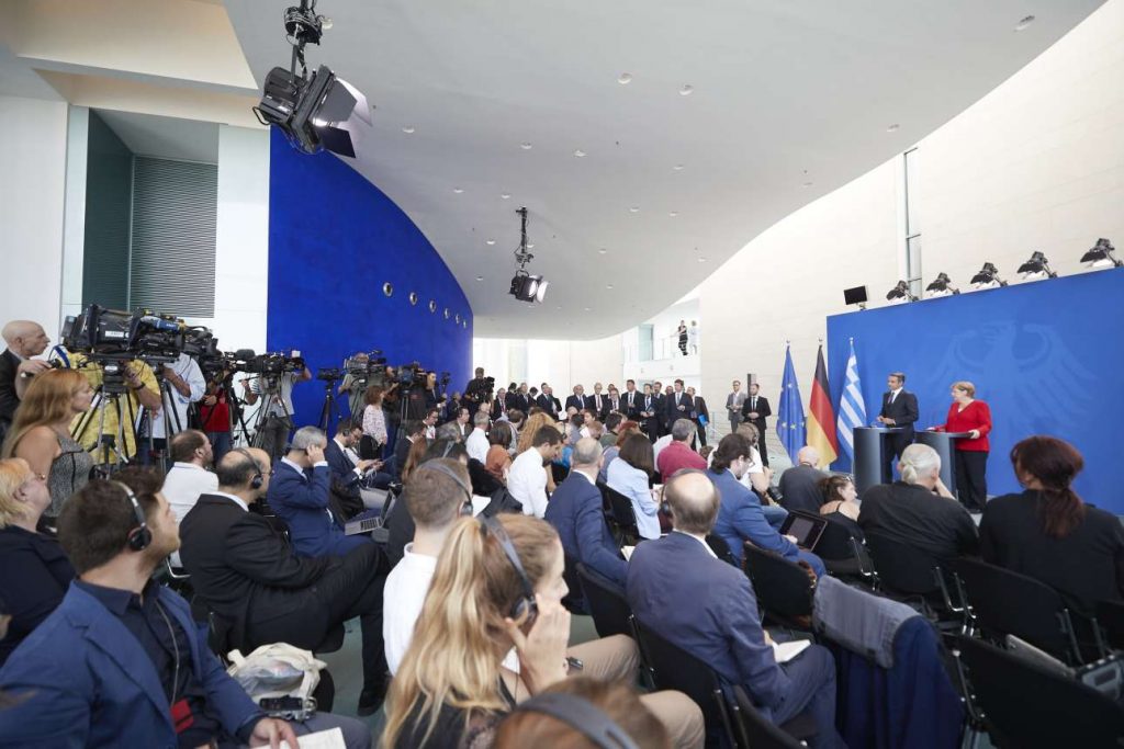 Ταύτιση απόψεων στο Μεταναστευτικό, βούληση για περαιτέρω βελτίωση των ελληνογερμανικών σχέσεων, κοινές δράσεις για την προσέλκυση γερμανικών επενδύσεων στην Ελλάδα, αλλά και διαβεβαιώσεις για την τήρηση των δημοσιονομικών στόχων από την Αθήνα, ήταν τα κύρια σημεία της κοινής συνέντευξης Τύπου που παραχώρησαν Κυριάκος Μητσοτάκης και Ανγκελα Μέρκελ μετά τη συνάντησή τους στο Βερολίνο -της πρώτης μετά την εκλογή του αρχηγού της ΝΔ στην πρωθυπουργία.