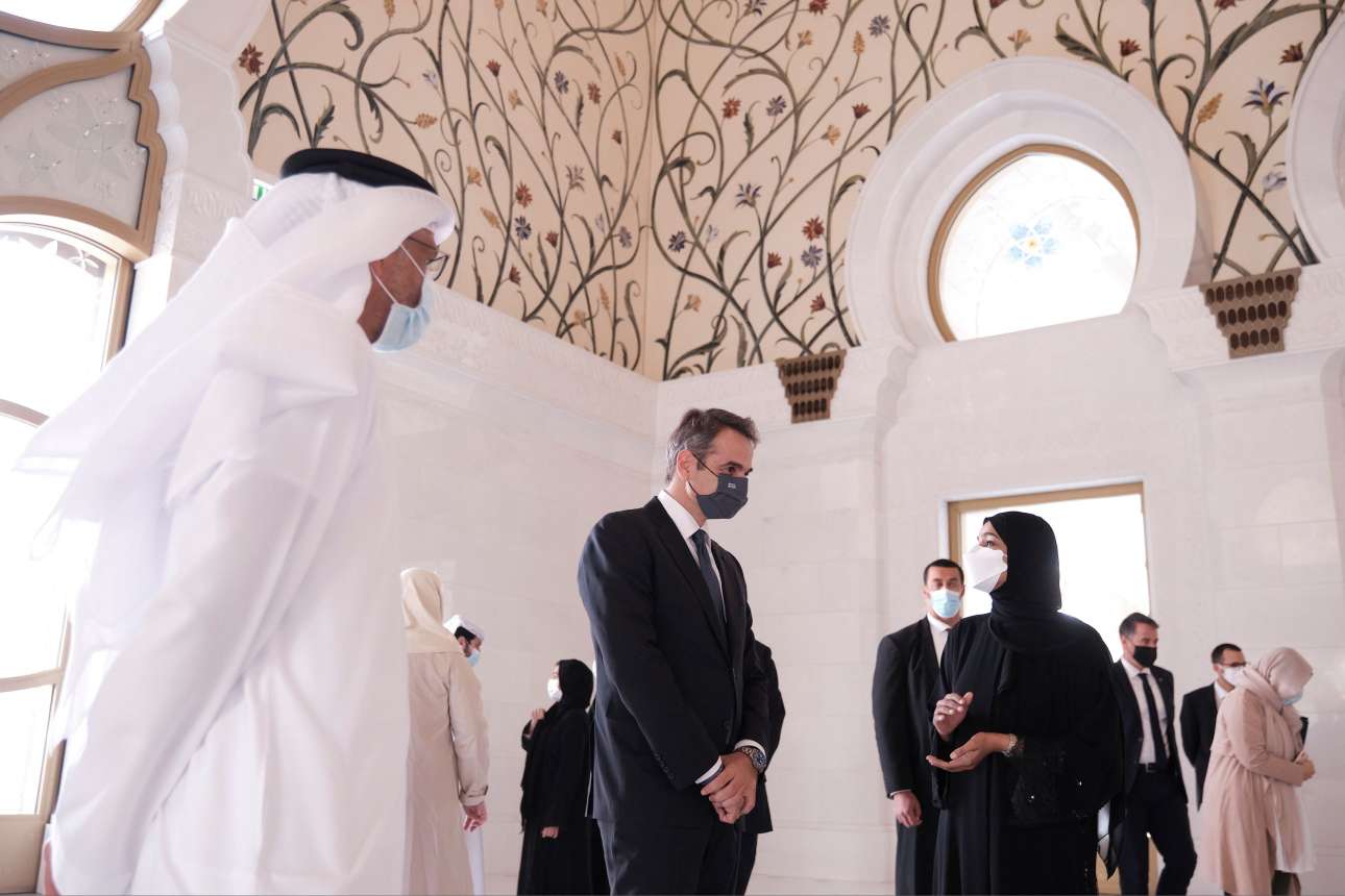 Ο Πρωθυπουργός ξεναγήθηκε στο Μεγάλο Τέμενος -το μεγαλύτερο τζαμί στα ΗΑΕ για την κατασκευή του οποίου έχει χρησιμοποιηθεί και μάρμαρο ελληνικής προέλευσης- ενώ άφησε το δικό του μήνυμα στο βιβλίο επισκεπτών που υπογράφουν οι αρχηγοί κρατών και κυβερνήσεων.
