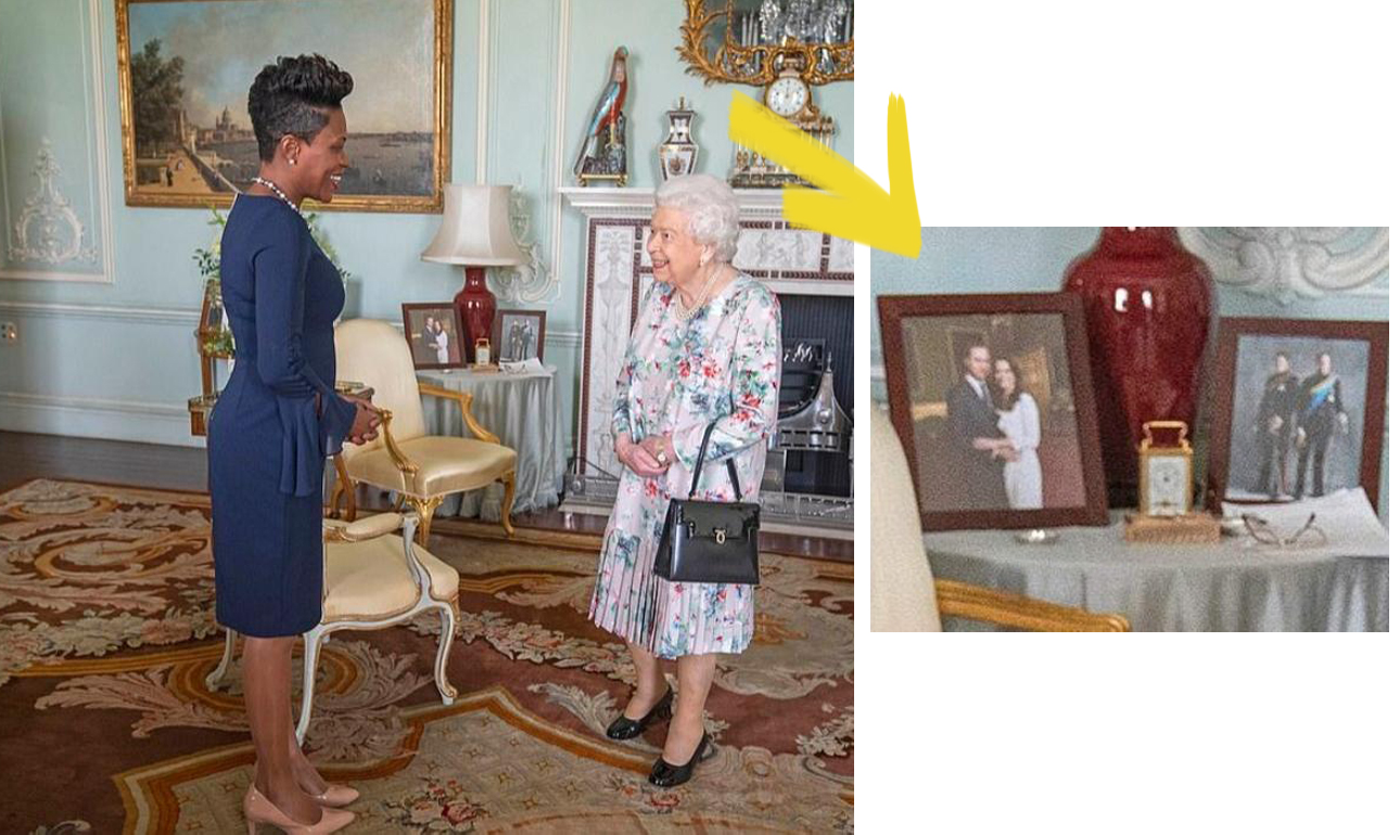 Πάμε τώρα στο σήμερα. Η κυρία Γκραντ, Επίτροπος της Βρετανίας στη Γκρανάντα (νησί στην Καραϊβική, μέλος της Κοινοπολιτείας), επισκέπτεται την βασίλισσα Ελισάβετ. Οι δυο τους φωτογραφίζονται -πού αλλού- στο σαλόνι υποδοχής. Πίσω το ξύλινο έπιπλο είναι ακόμα εκεί. Οπως και η φωτογραφία του Ουίλιαμ και της Κέιτ. Ομως εκείνη του Χάρι και της Μέγκαν έχει εξαφανιστεί.