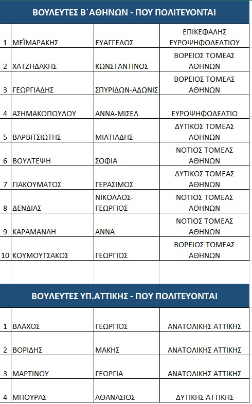 Παράλληλα, ανακοινώνονται και οι περιφέρειες στις οποίες θα πολιτευθούν οι εν ενεργεία βουλευτές της πρώην Β’ Αθήνας, του Υπολοίπου Αττικής, του ψηφοδελτίου Επικρατείας, αλλά και εκείνοι που προσχώρησαν στην Κοινοβουλευτική Ομάδα της ΝΔ.
