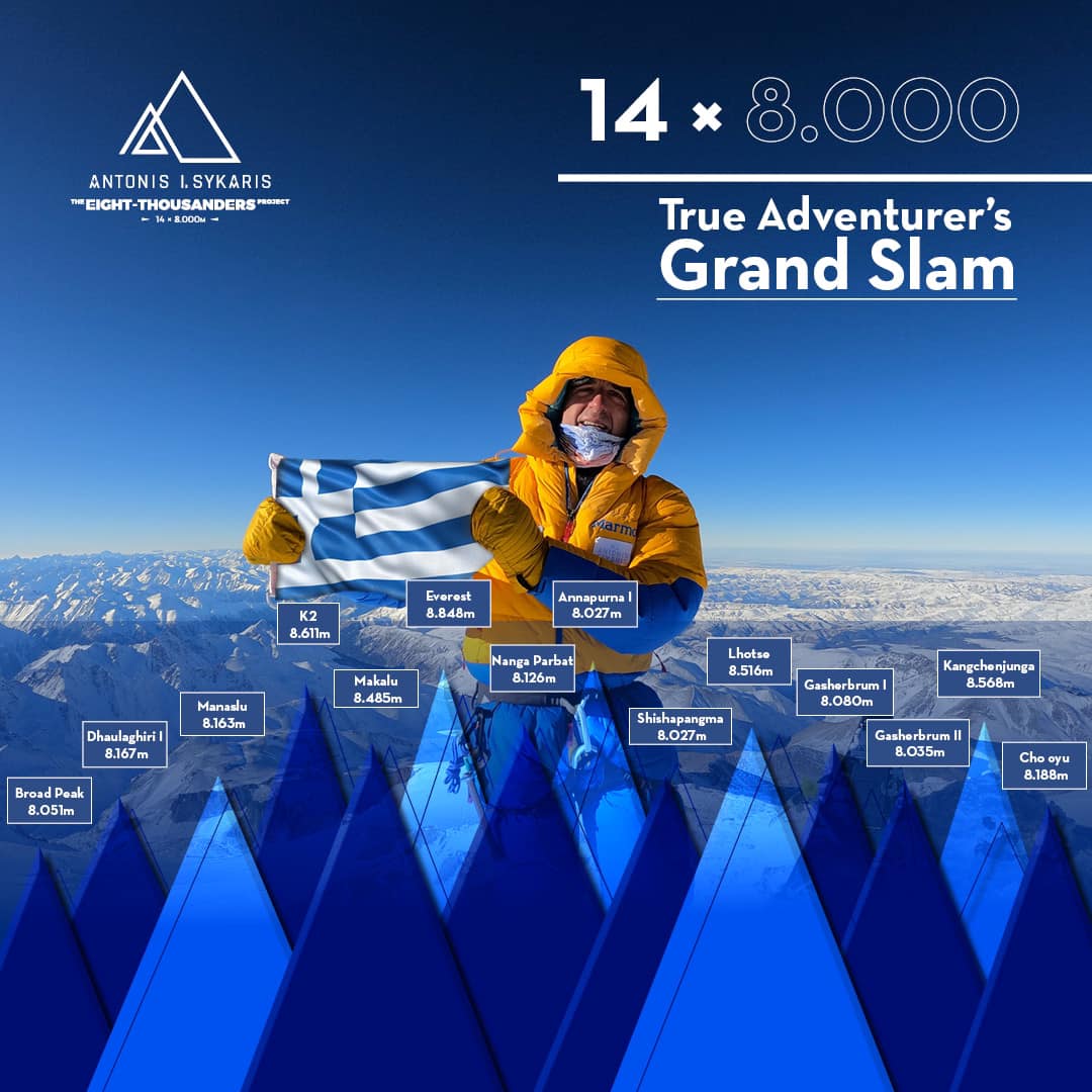 Μέλος από το 1991 του Συνδέσμου Ελλήνων Ορειβατών ΣΕΟ και της Ελληνικής Ομοσπονδίας Ορειβασίας και Αναρρίχησης ΕΟΟΑ, και αθλητής της Marmot Mountain Europe, ο Αντώνης Συκάρης είναι ο μοναδικός Ελληνας που έχει σκαρφαλώσει πέντε από τις 14 οκτάρες κορυφές της γης του κορυφαίου ορειβατικού project Grand slam: