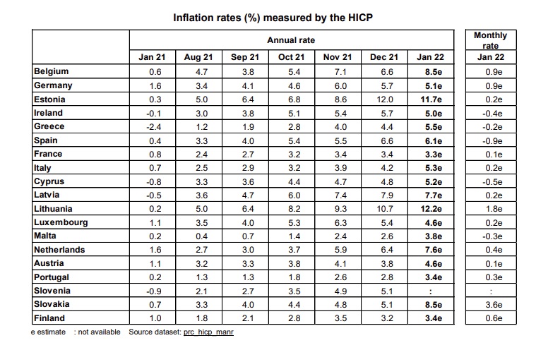 Σε επίπεδο ευρωζώνης, ο πληθωρισμός τον Ιανουάριο αναμένεται να διαμορφωθεί στο 5,1%, ενώ τρομακτικά είναι τα στοιχεία για τη Λιθουανία (12,2% από 10,7% τον Δεκέμβριο) και για την Εσθονία (11,7% τον Ιανουάριο από 12% τον Δεκέμβριο). Συγκριτικά χαμηλά διατηρείται ο πληθωρισμός στη Γαλλία (3,3%), στην Πορτογαλία και στη Φινλανδία (3,4%) και στη Μάλτα (3,8%). Στη Γερμανία ο πληθωρισμός υποχώρησε τον Ιανουάριο στο 5,1% από (5,7% τον Δεκέμβριο και 6% τον Νοέμβριο). Η Ιταλία σημειώνει αντίστοιχες επιδόσεις με την Ελλάδα καθώς ο πληθωρισμός εκτινάχθηκε στο 5,3% (από 4,2% τον Δεκέμβριο).