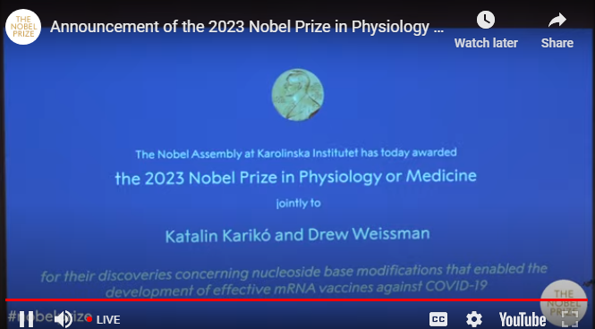 The 2023 #NobelPrize in Physiology or Medicine has been awarded to Katalin Karikó and Drew Weissman for their discoveries concerning nucleoside base modifications that enabled the development of effective mRNA vaccines against COVID-19. pic.twitter.com/Y62uJDlNMj— The Nobel Prize (@NobelPrize) October 2, 2023