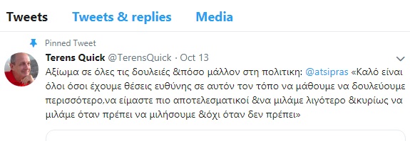 H απάντηση του Τέρενς Κουίκ ήρθε μέσω Twitter, με την υπενθύμιση των λόγω του Αλέξη Τσίπρα και την παραίνεση προς όλους να μιλούν λιγότερο.