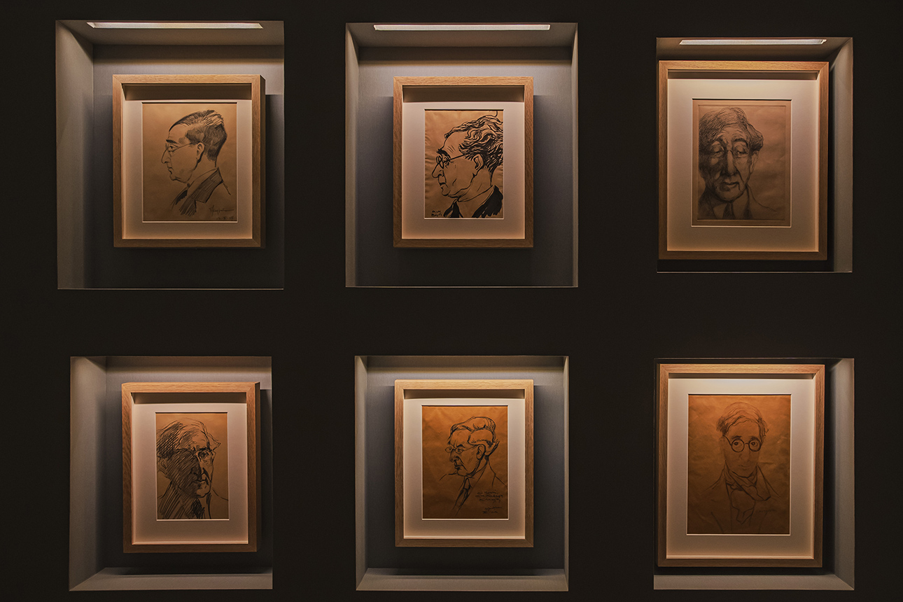Ακόμα, έξι προσωπογραφίες του οικουμενικού ποιητή από σύγχρονούς του καλλιτέχνες (Τάκη Καλμούχο, Ευθύμιο Παπαδημητρίου, Γιάννη Κεφαληνό κ.ά.). Στην ίδια αίθουσα εκτίθενται επίσης δύο αντικείμενα που ο ίδιος δεν άγγιξε ποτέ: η νεκρική μάσκα του και η πρώτη έκδοση των καβαφικών ποιημάτων (1935), μετά δηλαδή τον θάνατό του (σε φιλολογική επιμέλεια Ρίκας Σεγκοπούλου και εικονογράφηση Τάκη Καλμούχου).