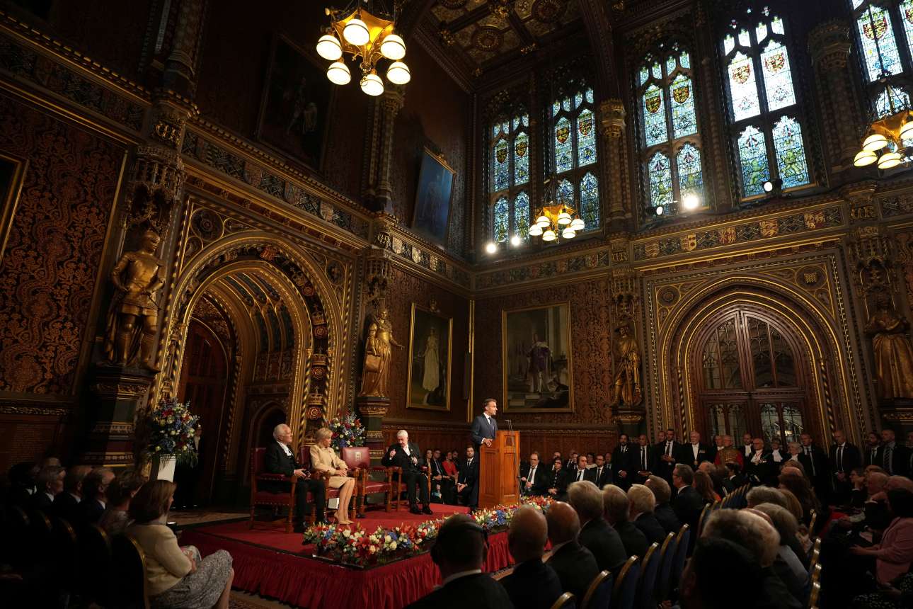 O Μακρόν απευθύνθηκε στα μέλη και των δύο σωμάτων του βρετανικού Κοινοβουλίου, συγκεντρωμένα στη μεγαλοπρεπή Αίθουσα του Βασιλικού Γκαλερί. Δήλωσε ότι οι δύο χώρες εκπροσωπούν «μια παγκόσμια τάξη βασισμένη στο δίκαιο, τη δικαιοσύνη και τον σεβασμό της εδαφικής ακεραιότητας — μια τάξη που σήμερα δέχεται καθημερινές επιθέσεις».