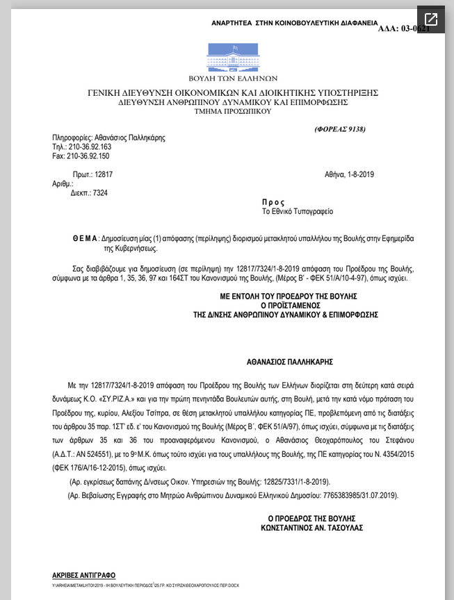 Η επιβράβευση αυτή όμως είχε και συνέχεια, καθώς στο όνομα της σοσιαλδημοκρατικής μετάλλαξης του ΣΥΡΙΖΑ, ο κ. Θεοχαρόπουλος ορίστηκε διευθυντής της Κοινοβουλευτικής Ομάδας του κόμματος της αξιωματικής αντιπολίτευσης (εδώ) , και τώρα στο φως της δημοσιότητας ήρθε και ο διορισμός του σε θέση μετακλητού υπαλλήλου στη Βουλή.