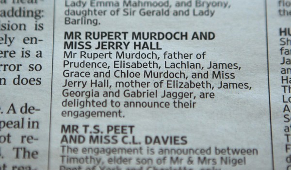 Αυτή, λοιπόν, είναι η αγγελία του ζεύγους που δημοσιεύτηκε στην στήλη με τα κοινωνικά των Times, της καθιερωμένης βρετανικής εφημερίδας που είναι εδώ και χρόνια στην ιδιοκτησία του Μέρντοκ. Στην αγγελία κυριαρχούν τα ονόματα των παιδιών του Μέρντοκ και της Χολ, έξι για τον Ρούπερτ και τέσσερα για την Τζέρι, καθώς και η χαρά και των δύο για την ανακοίνωση των αρραβώνων. Την απόφαση την πήραν μόλις μέσα στο Σαββατοκύριακο, αναφέρει το Sky News, ενώ προσθέτει το BBC ότι ο αρραβώνας έγινε στο Λος Αντζελες όπου και οι δύο παραβρέθηκαν στις Χρυσές Σφαίρες της περασμένης Κυριακής.